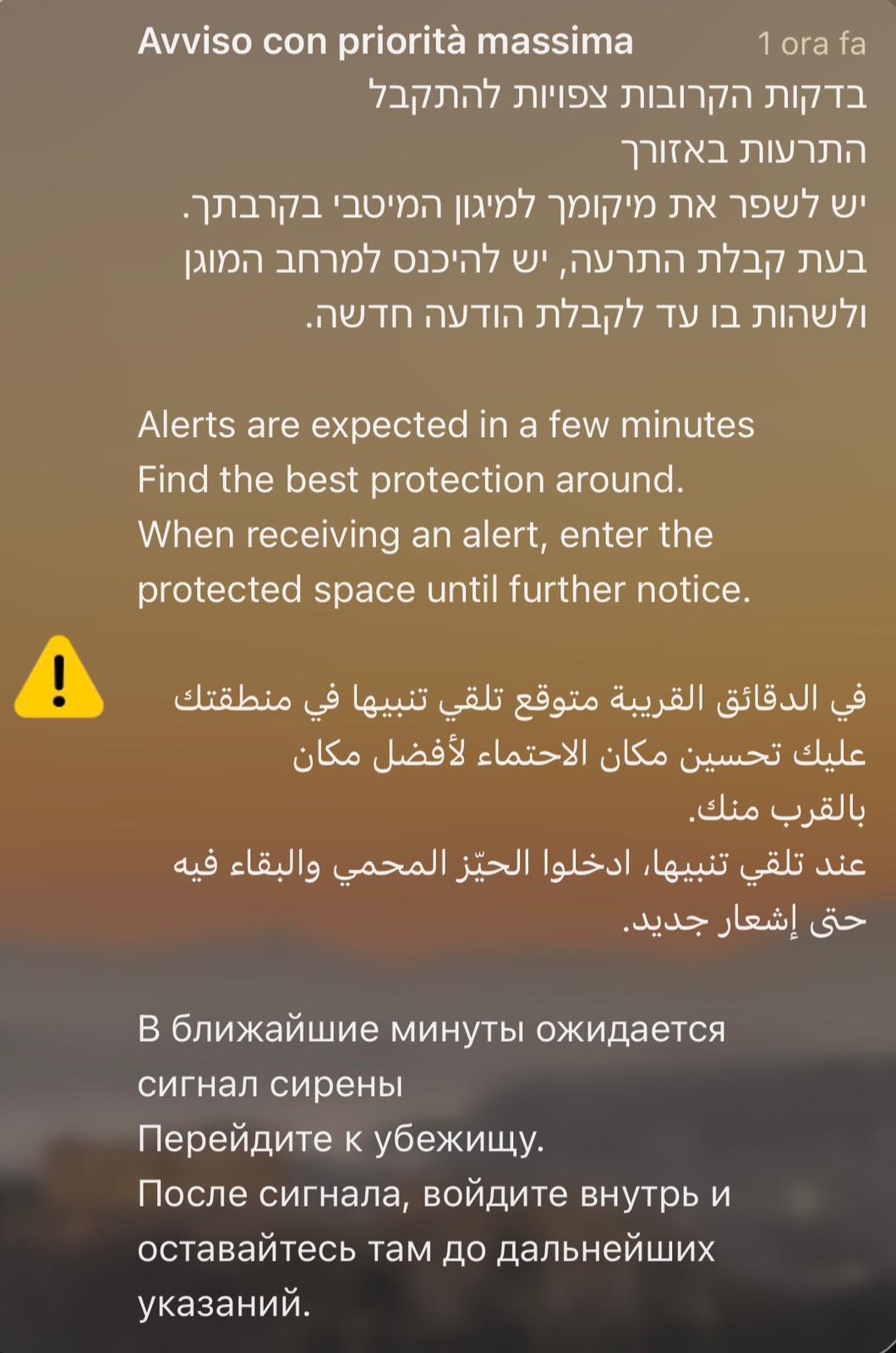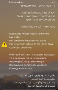 - se le sirene sono anticipate da un preallarme diffuso tramite notifica push sui cellulari (messaggio diffuso in ebraico, arabo, inglese e russo) in cui si notifica l’imminente suono delle sirene, si può uscire dai rifugi SOLO dopo la ricezione di un ulteriore messaggio tramite notifica push o avviso dell’applicazione del Home Front Command che autorizza l’uscita dai rifugi;